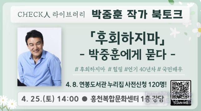 시민행정신문 강갑수 기자 | 홍천 군립 도서관이 오는 4월 25일 오후 2시 홍천 복합 문화센터 1층 강당에서 배우 겸 작가 박중훈을 초청해 2026년 ‘체크인 라이브러리’의 첫 번째 북토크를 개최한다.