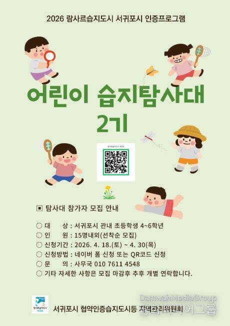 시민행정신문 김학영 기자 | 서귀포시협약인증습지도시등 지역관리위원회는 30일까지 서귀포시의 습지 가치를 알릴 ‘제2기 어린이 습지탐사대’ 대원을 모집한다.