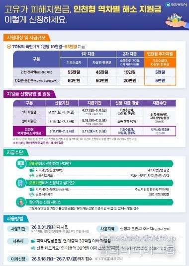 이와 함께 지역 간 지원 격차를 보완하기 위한 ‘인천형 역차별 해소 지원금’ 5만 원도 5월 11일부터 취약계층을 대상으로 추가 지급될 예정이다.