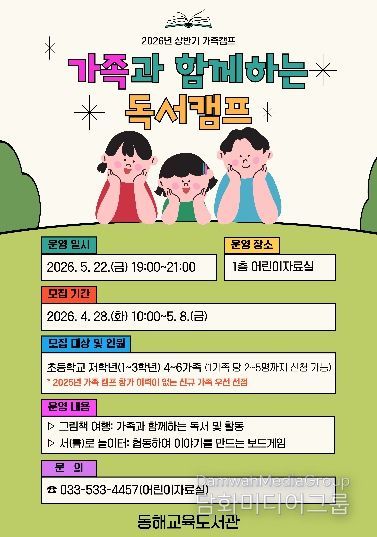 시민행정신문 기자 | 동해교육도서관(관장 안은희)은 5월 22일 오후 7시 어린이자료실에서 초등학교 저학년 자녀를 둔 가족을 대상으로 2026년 상반기 가족캠프 ‘가족과 함께하는 독서캠프’를 운영한다.