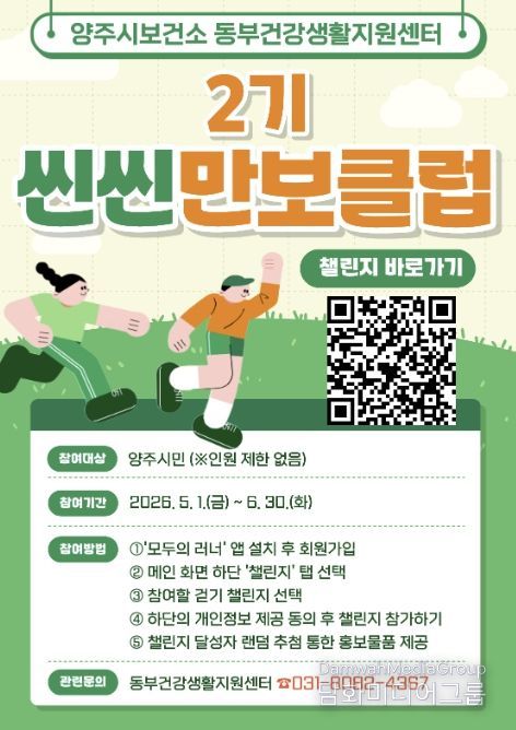 시민행정신문 기자 | 양주시보건소 동부 건강생활지원센터에서 지역 주민의 건강생활실천율 향상과 비만율 개선을 위해 ‘2026년도 씬씬 만보클럽 2기’ 참여자를 모집한다.