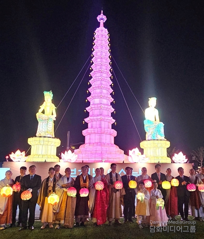 하이라이트인 점등 순간, 내빈 대표가 사부대중의 “불·법·승” 구호에 맞춰 점등 버튼을 누르자, 보현사 8각 13층 석탑 전통등이 찬란한 빛을 발하며 광장을 환히 밝혔다. 이어 동자·동녀가 앞장선 탑돌이 행렬이 세 차례 이어지며, 광화문광장은 물론 세상 전체를 밝히는 상징적 장면을 연출했다.