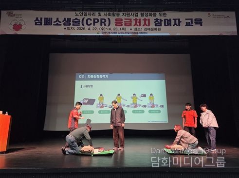 시민행정신문 기자 | (재)김해시복지재단 김해시니어클럽(김해노인일자리창출지원센터)에서는 지난 22일부터 23일까지 이틀간 김해문화원 공연장에서 노인일자리 노인역량활용사업 참여자를 대상으로 ‘심폐소생술(CPR) 응급처치 교육’을 실시했다.