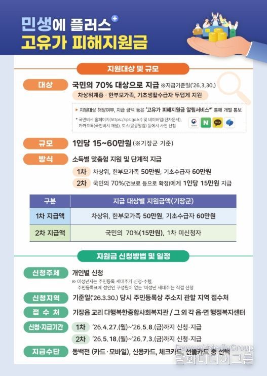 이번 지원 사업은 시급성을 고려해 대상별로 두 단계에 걸쳐 순차적으로 진행된다. 우선 1차로 취약계층을 지원하고, 이후 소득 기준 70% 이하 군민을 대상으로 2차 지급을 이어간다.