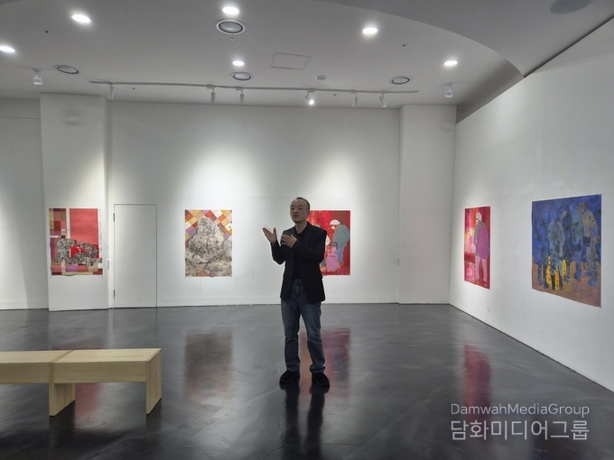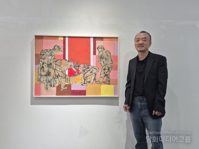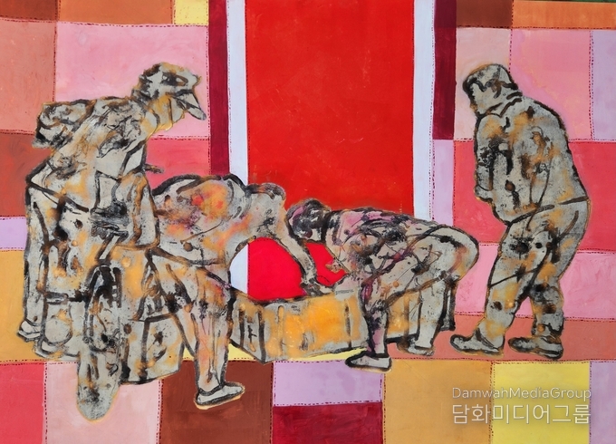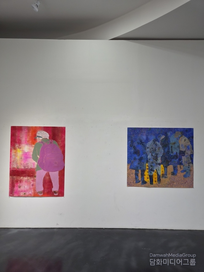 화면을 덮는 색면의 구조에서 붉은 색조는 응집된 생명력과 감정의 밀도를 상징하며, 푸른 색면은 거리와 사유, 침잠된 시간성을 암시하고 있으며, 흰 여백처럼 남겨진 공간은 비어 있음이 아니라 시선이 머무르고 감정이 순환하는 호흡의 장으로 기능한다. 이 색채의 장은 단순한 배경을 넘어 인간 군상이 놓인 심리적 환경이자 존재론적 무대가 되고 있다.