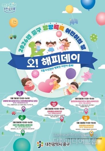 시민행정신문 기자 | 대전 중구가 다가오는 5월 1일부터 5일까지 '2026년 중구 방방곡곡 어린이의 달 오! 해피데이' 어린이달 축제를 개최한다고 밝혔다.