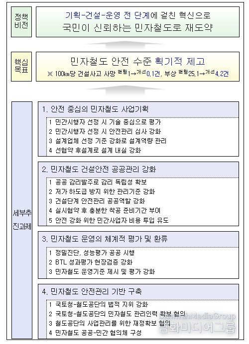 국토부는 민자철도 사업 패러다임을 효율성에서 안전으로 전환하는 것을 목표로 ‘사업기획-건설-운영 전 단계’에서 개선과제를 도출하는 한편, 국민의 눈높이에 맞는 안전한 민자철도 구축을 위한 공공역할 강화 방안을 모색했다.