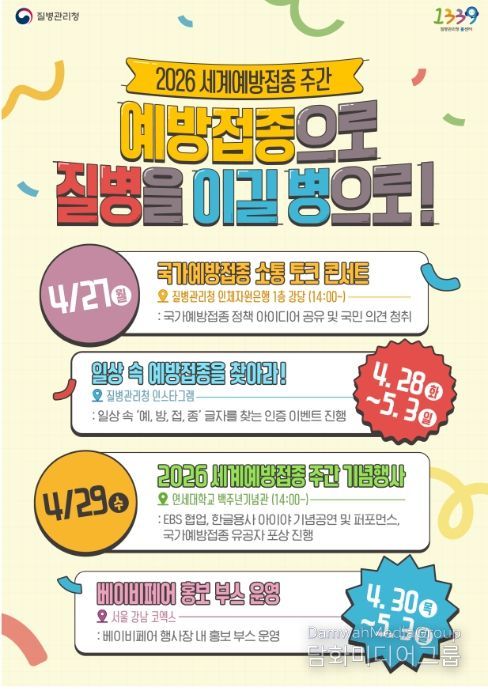 이번 '2026 예방접종주간행사'는 4월 27일(월)을 시작으로 ▲국민과 함께하는 토크 콘서트, ▲EBS 협업 어린이 공연 '한글용사 아이야', ▲온라인 참여이벤트, ▲코엑스 베이비페어(홍보부스 운영)까지 총 4개의 행사를 통해 예방접종주간의 의미를 효과적으로 확산시킬 예정이다.