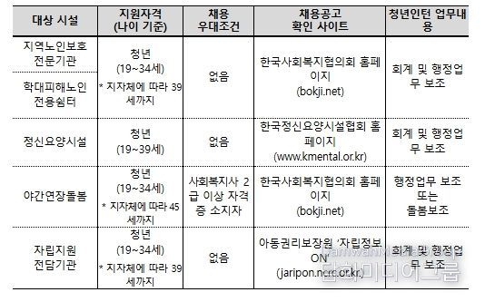이번 모집을 통해 선발되는 479명의 청년인턴은 전국 아동·노인·정신요양 시설 등 5개 유형의 시설에서 근무하게 된다.