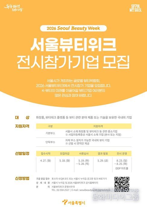 참여를 희망하는 기업은 5월 18일까지 구글 폼을 통해 신청할 수 있으며, 자세한 사항은 서울뷰티위크 공식 누리집 또는 서울시 누리집에서 확인할 수 있다.