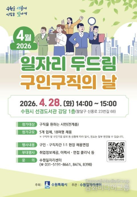 시민행정신문 강갑수 기자 | 수원특례시는 4월 28일 오후 2시부터 3시까지 선경도서관 강당에서 ‘4월 일자리 두드림 구인·구직의 날’을 개최한다.