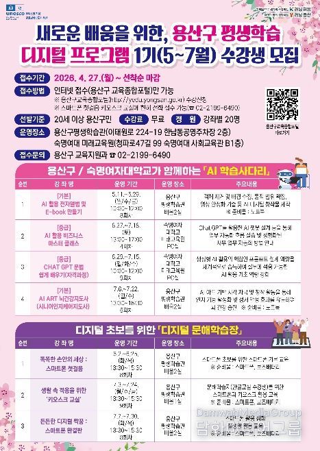 박희영 용산구청장은 “이번 공모사업 선정은 용산형 평생교육 정책의 의미 있는 성과이자, 지속 가능한 학습 도시로 도약하는 계기”라며, “앞으로도 구민 누구나 배움의 기회를 누릴 수 있도록 다양한 평생학습 기반을 확대해 나가겠다”라고 말했다.