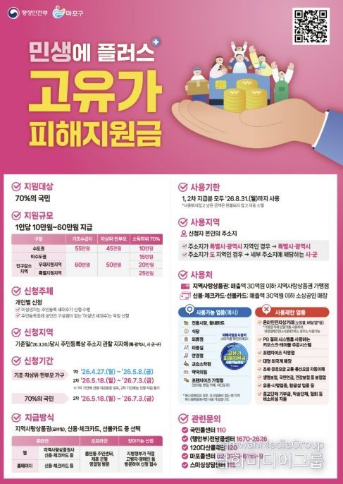 시민행정신문 이세훈 기자 | 마포구는 중동 전쟁 여파로 이어진 고유가·고물가 상황 속에서 구민의 경제적 부담을 덜고 지역경제에 활력을 불어넣기 위해 ‘고유가 피해지원금’을 지급한다.