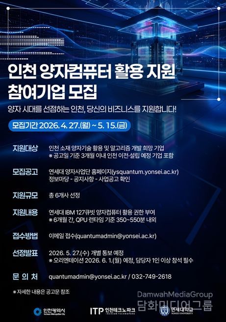 시는 연세대학교와 협력해 ‘2026년 인천 양자컴퓨터 활용 지원사업’에 참여할 기업을 모집한다.