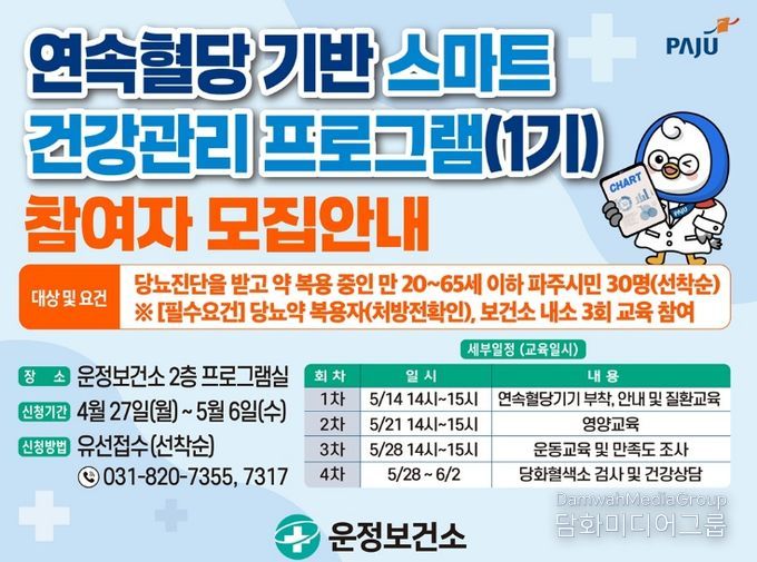 정영숙 운정보건소장은 “당뇨병은 꾸준한 관리가 무엇보다 중요한 질환으로, 자신의 혈당 변화를 정확히 아는 것이 관리의 출발점”이라며 “이번 프로그램을 통해 참여자들이 혈당 데이터를 기반으로 올바른 식습관과 운동 습관을 형성하고, 합병증 예방에 실질적인 도움을 받을 수 있기를 기대한다”라고 말했다.