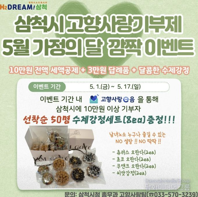 시민행정신문 강갑수 기자 | 삼척시는 고향사랑 기부 문화의 안정적인 정착과 기부 활성화를 위해 5월 가정의 달을 맞아 '삼척시 고향사랑기부제 5월 가정의 달 깜짝 이벤트'를 진행한다.