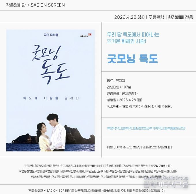 오는 4월에는 뮤지컬 '굿모닝 독도'를 상영한다. 이 작품은 예술의전당이 제작한 창작 뮤지컬로 사랑과 역사적 의미를 함께 풀어낸 작품이다. 독도를 지키며 살아온 할아버지와 그의 손자 시우의 이야기를 중심으로 전개되며, 시우가 일본인 연인 유코와의 결혼을 꿈꾸는 과정에서 할아버지의 반대에 부딪히여 갈등이 펼쳐진다. 독도를 둘러싼 역사적 배경과 상징성을 바탕으로 ‘기억’과 ‘정체성’, 그리고 ‘공존’에 대한 메시지를 전달한다. 시우와 유코, 그리고 할아버지의 관계는 갈등과 이해의 과정을 거치며 점차 변화하고, 관객들에게 깊은 울림과 여운을 남긴다.