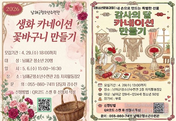 시민행정신문 강갑수 기자 | 남해군 청소년수련관은 가정의 달 5월과 어버이날을 맞아 청소년 대상 문화체험 프로그램 ‘카네이션 만들기 원데이클래스’를 운영한다고 밝혔다.