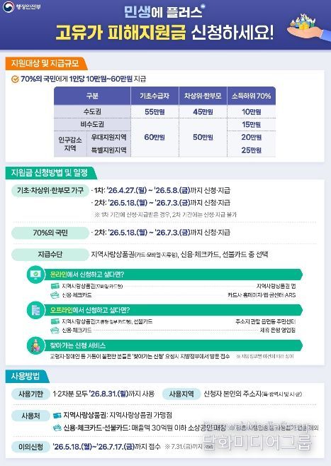 4월 27일부터 5월 8일까지 진행되는 1차 지급 대상은 기초생활수급자, 차상위계층, 저소득 한부모가족이다. 지원 금액은 ▲기초생활수급자 55만 원 ▲차상위계층·저소득 한부모가족 45만 원이다.