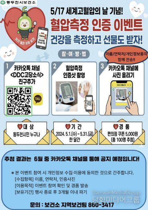 이번 이벤트는 5월 1일부터 5월 31일까지 한 달간 진행되며, 동두천시민이라면 누구나 참여할 수 있다. 참여 방법은 ▲카카오톡 채널 ‘DDC고당소식’친구 추가 ▲혈압 측정 후 인증 사진 촬영 ▲카카오톡 채널을 통해 사진과 함께 이름, 연락처, 개인정보 수집·이용 동의서 제출 순으로 간단하게 참여할 수 있다.