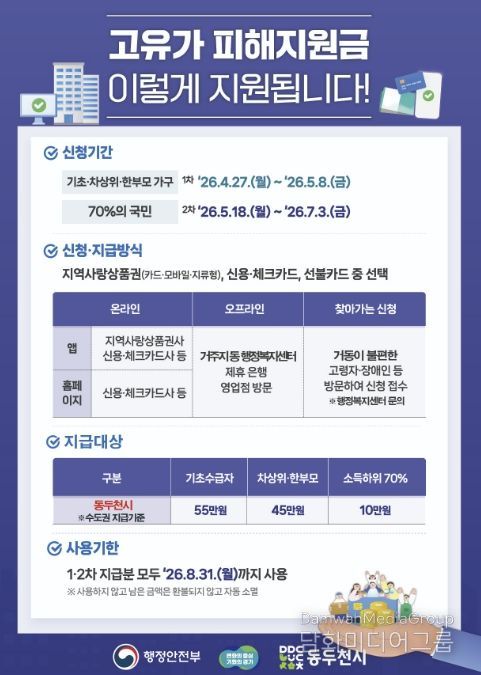 시민행정신문 이세훈 기자 | 동두천시가 중동발 고유가와 고물가로 인한 시민 부담을 완화하고 지역경제 회복을 지원하기 위해 ‘고유가 피해지원금’을 지급한다.