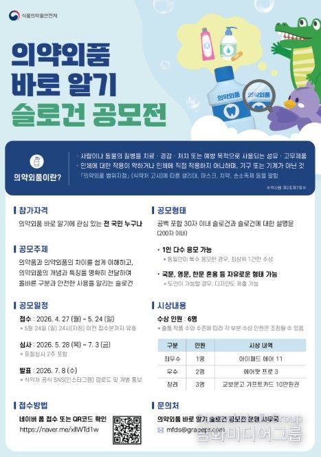 시민행정신문 이존영 기자 | 식품의약품안전처는 의약외품을 의약품과 구분하여 올바르게 사용할 수 있도록 ‘의약외품 바로알기 슬로건’ 공모전을 4월 27일부터 5월 24일까지 개최한다고 밝혔다.