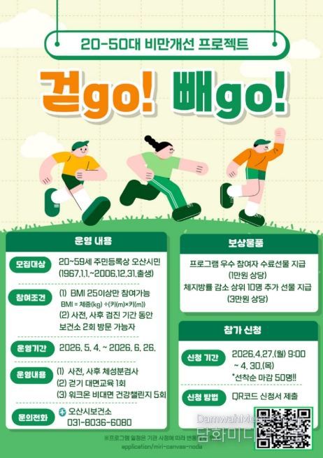참여 대상은 주민등록상 오산시에 거주하는 20세부터 59세까지 시민 가운데 체질량지수(BMI) 25kg/㎡ 이상인 시민으로, 사전·사후 검진 기간 중 보건소 2회 방문이 가능해야 한다. 신청 기간은 4월 27일부터 4월 30일까지이며, 선착순 50명을 모집한다. 참여를 희망하는 시민은 홍보 전단지에 안내된 QR코드를 통해 신청서를 제출하면 된다.