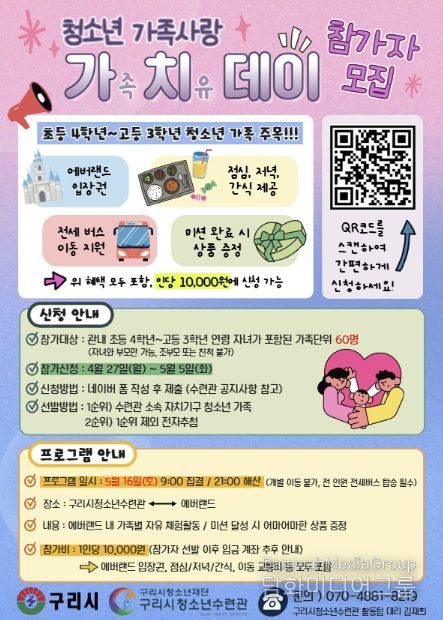 모집 대상은 구리시 관내 초등학교 4학년부터 고등학교 3학년까지의 자녀를 포함한 가족 총 60명이다. 참가자 전원에게는 에버랜드 자유이용권을 비롯해 식사와 간식, 전세버스 이동 지원 등이 제공된다.
