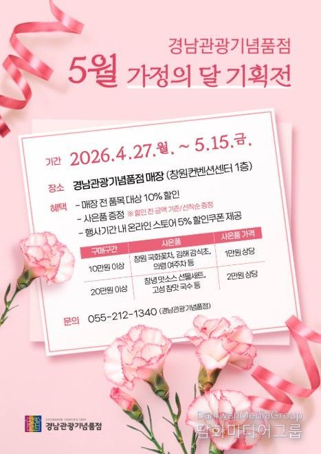 김상원 경남도 관광개발국장은 “가정의 달을 맞아 경남의 우수한 관광기념품이 소중한 분들께 전해지는 따뜻한 선물이 되길 바란다”며 “이번 기획전이 지역 경제 활성화와 관광산업 경쟁력 강화에 기여하는 계기가 되길 기대한다”고 밝혔다.