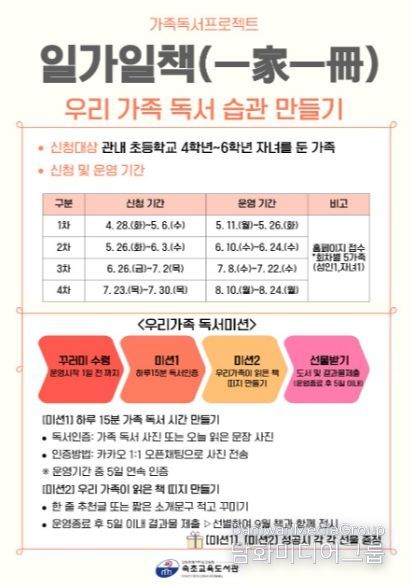 참여 가족에게는 선정도서와 독서대, 모래시계 등이 포함된 ‘일가일책 꾸러미’를 제공하며, 매일 15분 독서 인증과 독후활동(책 띠지 만들기) 미션을 수행하도록 지원한다.