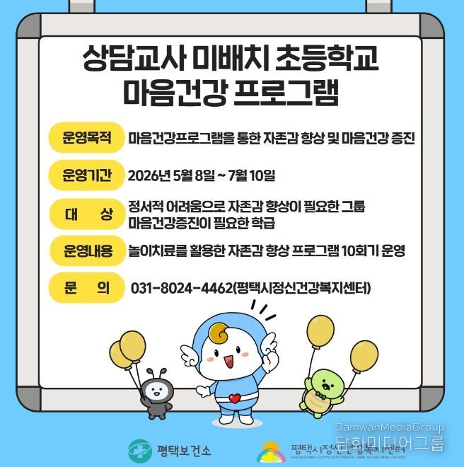 시민행정신문 기자 | 평택시는 상담교사가 배치되지 않은 초등학교 학생들의 정신건강 지원을 위해 ‘마음건강 프로그램’을 운영한다고 밝혔다.