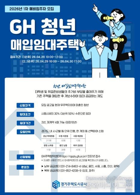 시민행정신문 강갑수 기자 | 경기주택도시공사(GH)가 청년층 주거 부담을 덜고 안정적인 생활 기반을 마련할 수 있도록 청년 및 자립준비 청년을 위한 매입임대주택 예비입주자 396명을 모집한다고 27일 밝혔다.