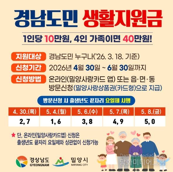 시민행정신문 이세훈 기자 | 경남 밀양시는 오는 4월 30일부터 시민 생활 안정을 지원하기 위한 ‘경남도민 생활지원금’ 신청을 받는다고 밝혔다.