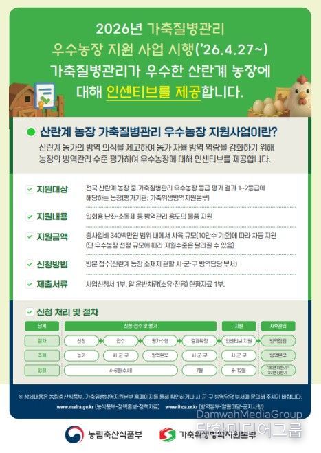 시민행정신문 김학영 기자 | 농림축산식품부는 축산농가의 방역역량을 강화하고 가축전염병 발생을 사전 예방하기 위해 '가축질병관리 우수농장 지원사업'을 2026년 4월부터 본격 추진한다고 밝혔다.