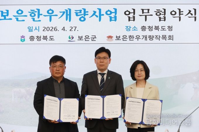 시민행정신문 이세훈 기자 | 충청북도축산기술연구소가 27일 도청 여는마당에서 보은군, 보은한우개량작목회와 함께 한우개량사업 경쟁력 강화 및 우량 유전자원 확산을 위한 업무협약(MOU)을 체결했다.