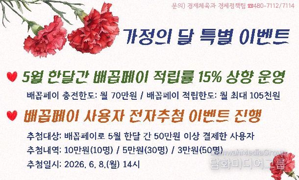 이미숙 경제체육과장은 “가정의 달을 맞아 추진하는 이번 특별이벤트가 지역 내 소비를 촉진하고, 소상공인과 자영업자의 매출 증대는 물론 지역경제 활성화에도 기여할 것으로 기대한다”고 말했다.