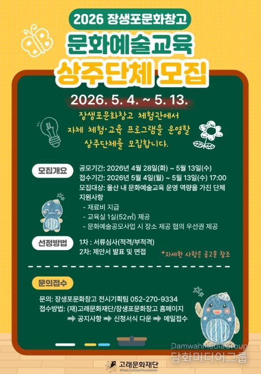 장생포문화창고 관계자는 “예술 단체들이 선보이는 창의적인 수업을 통해 우리 아이들과 시민들이 예술과 더 가까워지고, 누구나 차별 없이 문화예술을 즐길 수 있는 행복한 공간이 되길 바란다”고 밝혔다.