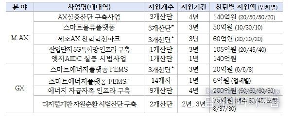산업부는 2019년부터 현재까지 24개 산업단지를 스마트그린산단으로 지정했으며, 스마트그린산단을 대상으로 AX 실증산단 구축, 에너지 자급자족 인프라 구축 등 산업단지의 M.AX와 GX를 위한 스마트그린산단 지원사업을 추진 중이다.