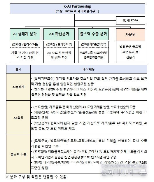 K-AI Partnership 공동의장은 KOSA 조준희 협회장과 네이버클라우드 김유원 대표가 맡았으며, ▲AI 생태계 경쟁력 강화 ▲AX 확산 ▲AI 풀스택 수출을 위한 3개 분과를 운영한다.