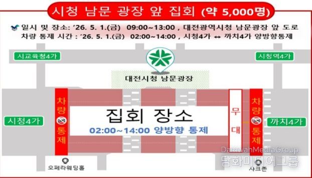 이번 집회는 5월 1일 오전 9시부터 오후 1시까지 대전시청 남문광장 일원에서 개최되며, 행사 준비와 안전 확보를 위해 오전 2시부터 주변 도로가 단계적으로 통제된다.