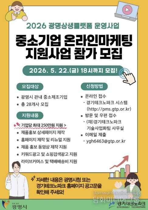 시는 관내 중소기업의 온라인 시장 진출과 판로 확대를 지원하는 ‘2026년 광명시 중소기업 맞춤형 온라인 마케팅 지원사업’ 참여기업을 오는 5월 22일까지 모집한다.