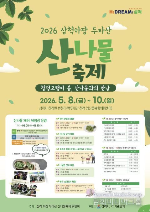 시민행정신문 기자 | 삼척시는 2026년 제13회 ‘삼척 하장 두타산 산나물 축제’가 5월 8일부터 10일까지 백두대간 청정임산물 복합체험센터(삼척시 하장면 두타로 499) 일원에서 개최된다고 밝혔다.