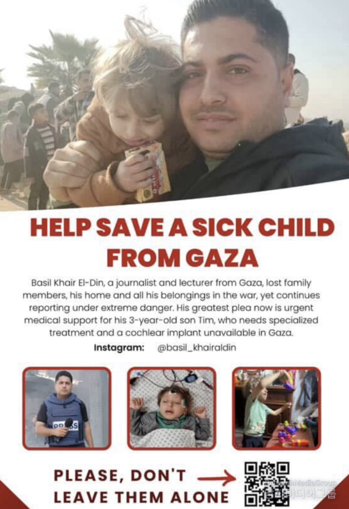 이러한 가운데, 본지(외교저널)는 최근 가자지구에서 활동 중인 언론인 바셀 카이르 알딘(Basel Khair Al-Din) 씨로부터 긴급한 요청이 담긴 이메일을 수신했다. 그의 아들 팀(Tim Basil Maher Ahmed Khairaldin, 만 3세)은 가자지구 중부 알마가지(Al-Maghazi) 난민캠프에 머물며, 극도로 열악한 의료 환경 속에서 생존을 위한 사투를 이어가고 있는 것으로 전해졌다.