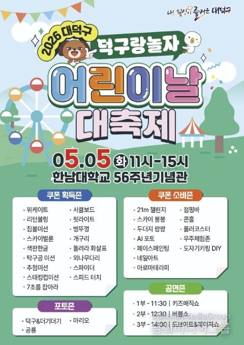 대덕구 관계자는 “아이들이 자유롭게 뛰어놀 수 있는 축제의 장을 마련했다”며 “가족과 함께 소중한 추억을 만드는 시간이 되길 바란다”고 말했다.