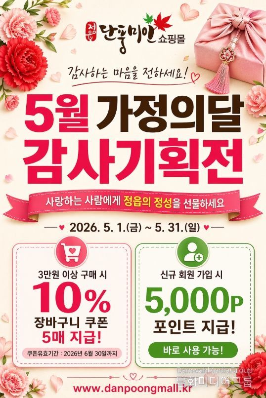 시민행정신문 이세훈 기자 | 정읍시가 다가오는 5월 가정의 달을 맞아 시민과 전국 소비자에게 감사의 마음을 전하고 지역 우수 농특산물 소비를 활성화하기 위해 ‘단풍미인쇼핑몰 5월 가정의 달 기획전’을 운영한다.