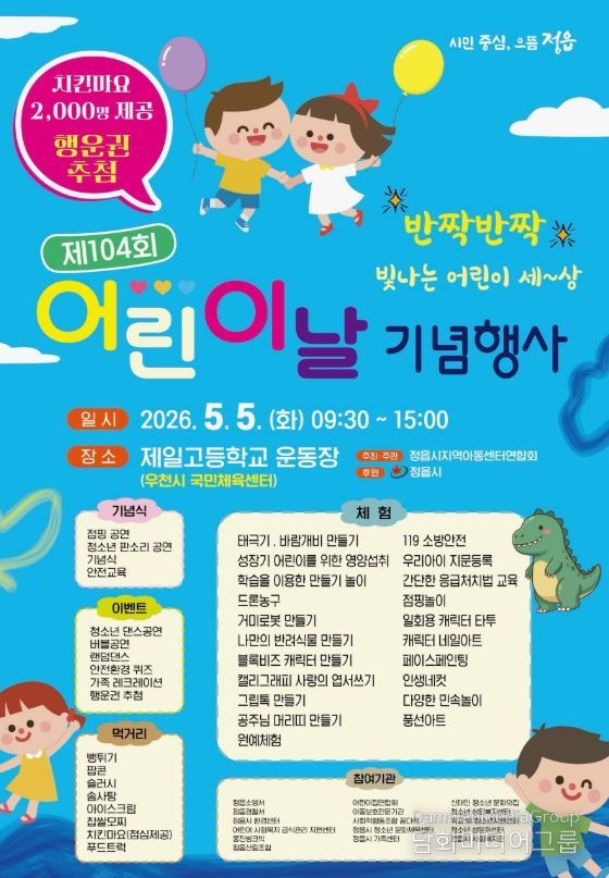 시민행정신문 강갑수 기자 | 정읍시는 다가오는 제104회 어린이날을 맞아 오는 5월 5일 정읍제일고등학교 운동장(우천 시 국민체육센터)에서 어린이날 기념행사를 개최한다.