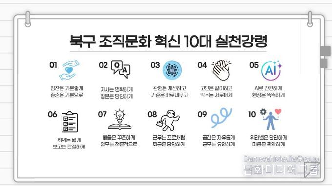 한편, 오는 30일 오후 3시 북구청 3층 회의실에서는 ‘조직문화 혁신을 위한 10대 실천 강령 선언식’이 개최된다.