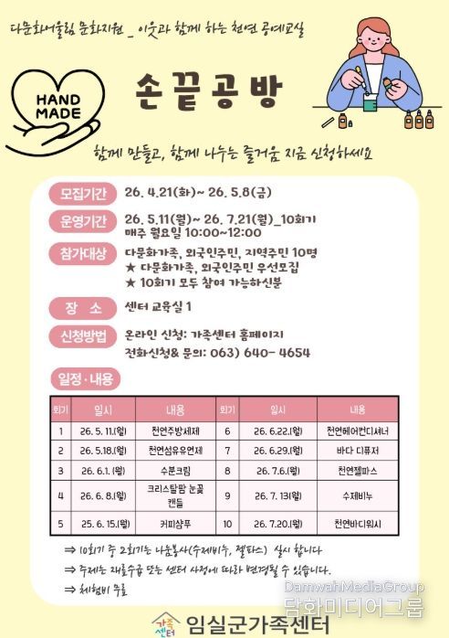 임실군 가족센터 관계자는 "손끝공방은 언어와 문화의 경계를 넘어 함께 만들고 나누는 과정에서 자연스럽게 이웃이 되는 프로그램"이라며 "지역 내 다문화가족과 외국인주민, 지역주민 모두의 많은 참여를 바란다"고 전했다.