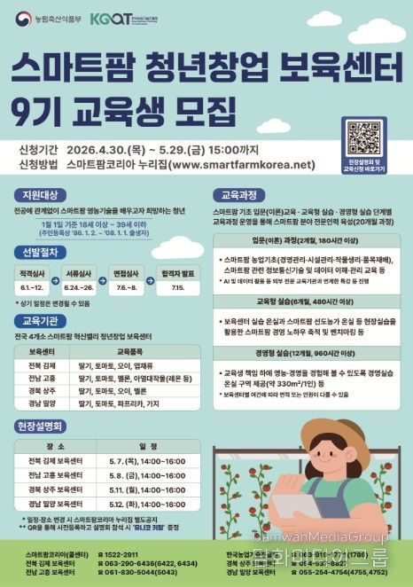 시민행정신문 이존영 기자 | 농림축산식품부는 4월 30일부터'스마트팜 청년창업 보육센터'의 2026년 신규 교육생을 모집한다.