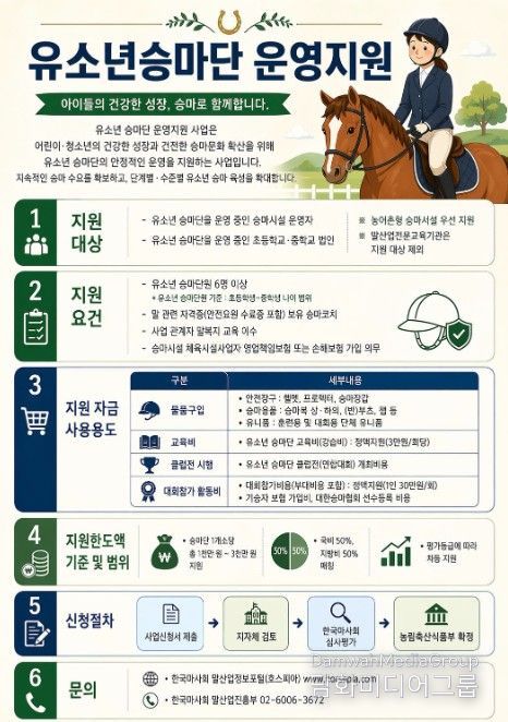 시민행정신문 장규호 기자 | 농림축산식품부와 한국마사회는 승마를 통해 지역 사회 유소년들이 새로운 꿈과 기회를 발견할 수 있도록 전국 57개 유소년 승마단의 운영을 지원한다